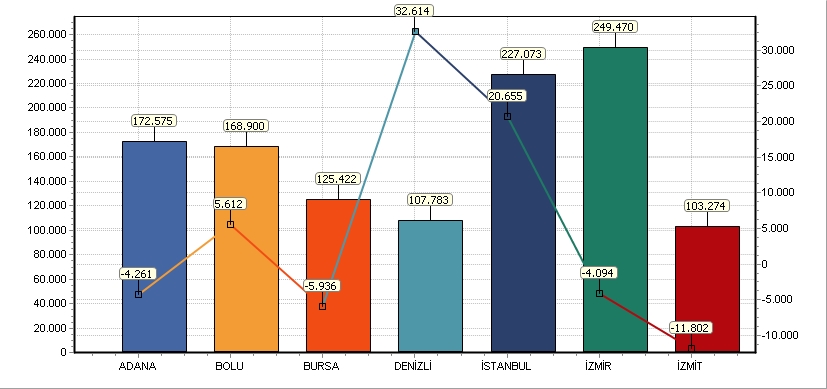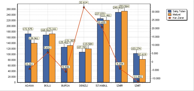 Aşağıdaki ilk resimde iller bazındaki satış tutarları kolon, kar-zarar tutarları ise çizgi grafik olarak gösterilmektedir. İkinci resimde iller bazındaki satış ve maliyet tutarları kolon, kar-zarar tutarları ise çizgi grafik olarak gösterilmektedir.