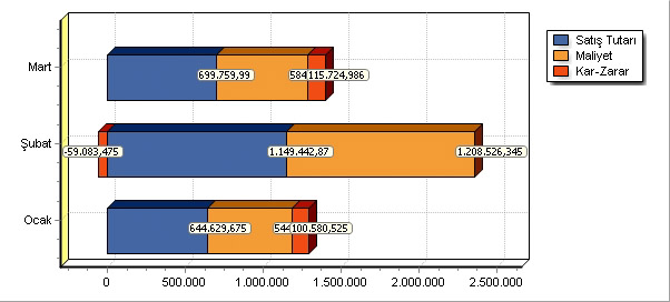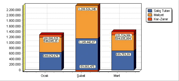 Kolon, çubuk grafikleri kullanarak aldığınız raporlarda birden fazla seri kullandığınızda; veri grubunda bulunan elaman sayısı da fazlaysa kümelenmiş grafikleri kullanmak raporunuzun okunurluğunu arttıracaktır. Aşağıda aylar bazında satış, maliyet ve kar-zarar değerlerini incelediğiniz kolon ve çubuk grafik tarzındaki iki raporun normal ve kümelenmiş hallerini görüyorsunuz.